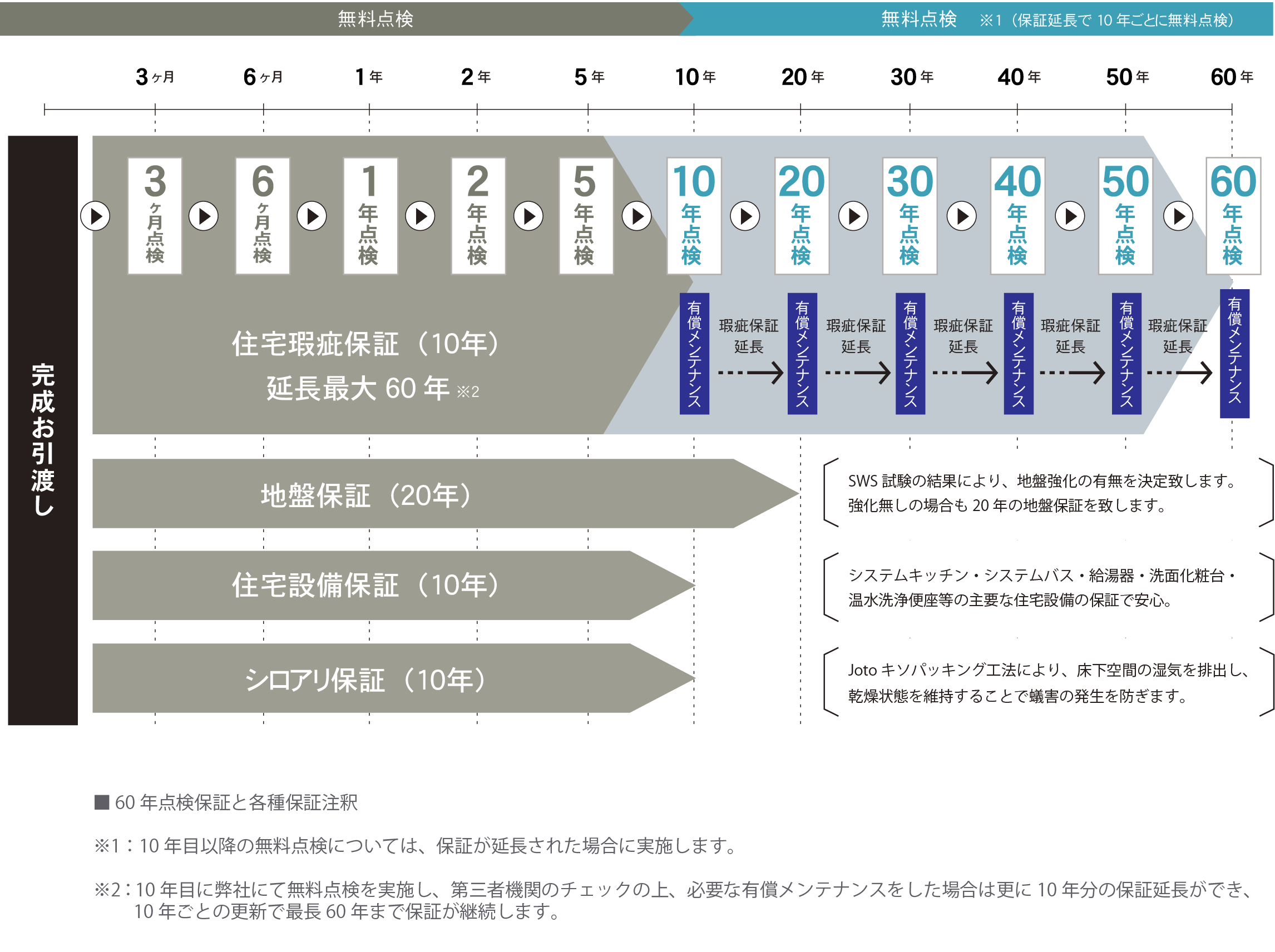 住宅の引渡日から10年間「住宅瑕疵」について保証がついています。自社の検査に加え、保証会社による3回の厳正な現場検査を実施しています。有償メンテナンスを条件として、10年毎の保証延長を継続することができ、最長60年間の保証を致します。